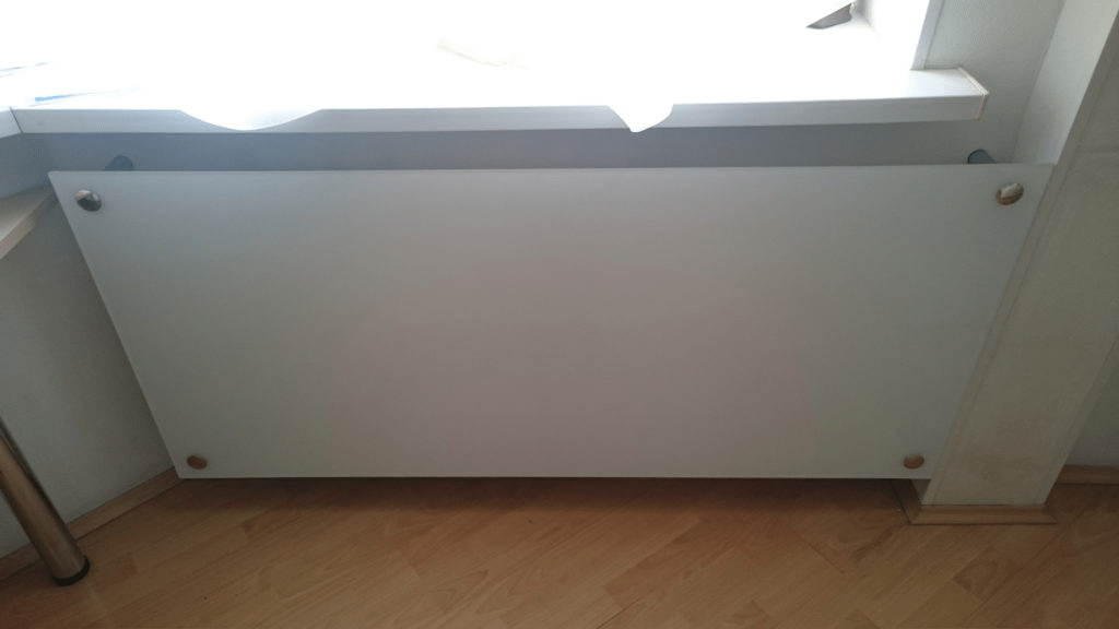 - Стеклянные экраны на радиаторы появились несколько лет назад. Они неидеальны с точки зрения отопления, но имеют привлекательный вид. Делают их из особого закаленного стекла, матируют или наносят рисунок.