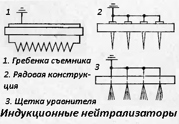 Снять напряжение призваны индукционные нейтрализаторы. Вся конструкция напоминает металлический гребень, парящий на некотором расстоянии над диском. В точку съема заряда приходят оба диска с эквивалентными знаками внешней поверхности. Нейтрализаторы спарены. После осуществления разгрузки сильно снижается заряд сегментов. В дополнительных конструкциях щетка легко соприкасается с краем диска.