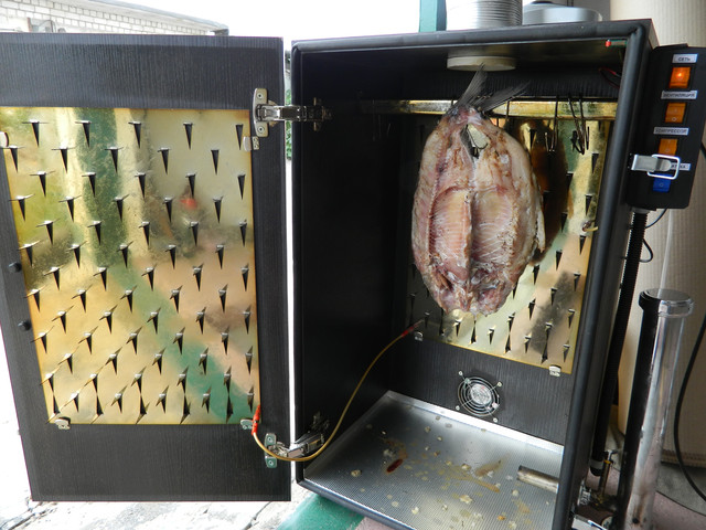 В любом деле после сборки изделия наступает период испытаний. Повесив пару кусков просоленного сала на специальные мощные крючки, я уложил в корыто несколько черемуховых чурочек и включил нагреватель в сеть. Примерно через 30 минут из всех щелей коптильного шкафа повалил дым. Процесс оказался легко управляем.