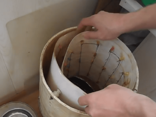 - Подготовка электроплитки. С нее снимают крышку, а из корпуса вынимают все внутренности кроме нагревательного элемента. Его с двумя проводами крепят к центру нижней части бочки при помощи винтов.
