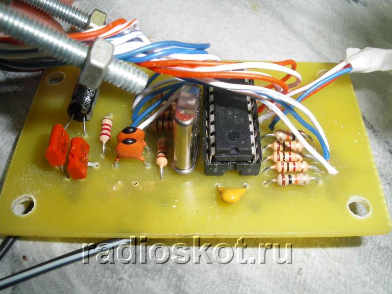 Кварц на 10 мГц – 1 шт, микроконтроллер ATtiny 2313, резисторы на 100 Ом – 8 шт., 3 шт. на 10 кОм, 2 конденсатора по 22 пФ, 4 транзистора, 2 кнопки, светодиодный индикатор 4 разрядный KEM-5641-ASR (RL-F5610SBAW/D15). Монтаж я выполнял на одностороннем текстолите.