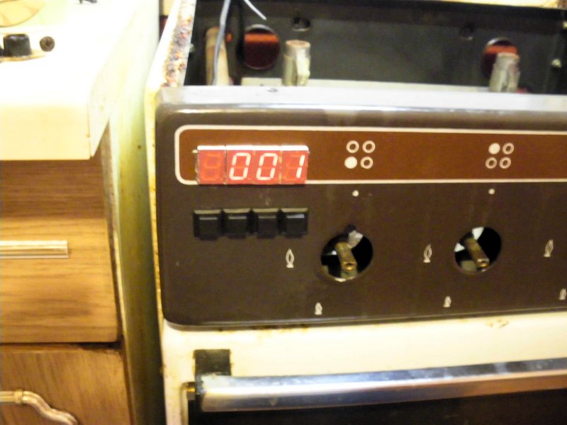 Если в течение нескольких секунд ни одна из кнопок не нажата, то электронные часы переходят в режим отображения времени. Нажатием на кнопку «Вкл/Выкл» включается или выключается будильник, это действие подтверждается коротким звуком. При включенном будильнике светится точка в младшем разряде индикатора. Думал куда бы пристроить часы на кухне, и решил вмонтировать их прямо в газовую плиту:) Материал прислал in_sane.