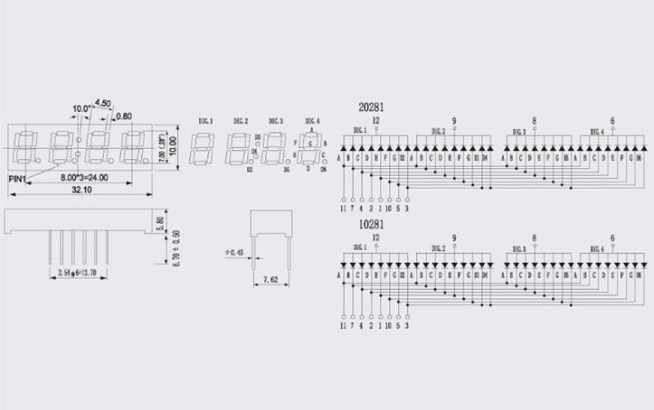 Дисплей часов изготовлен из четырех больших светодиодных цифровых индикаторов. Первоначально они были с общим катодом, но изменены на общий анод в финальной версии. Вы можете ставить любые другие, потом просто подберёте токоограничительные резисторы R1-R7 исходя из требуемой яркости. Можно было разместить его на общей, с электронной частью часов, плате, но так гораздо универсальнее – вдруг вы захотите поставить очень большой LED индикатор, чтоб их было видно на дальнем расстоянии. Пример такой конструкции уличных часов есть тут.