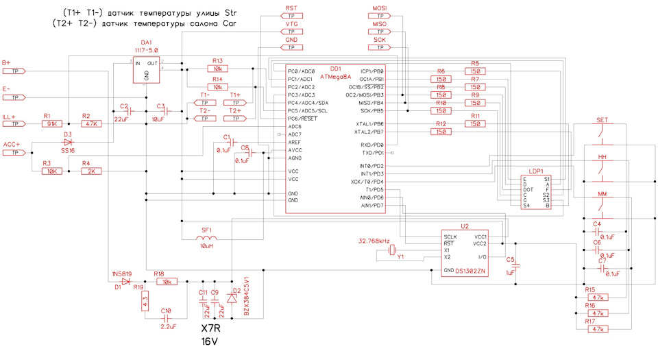 Для тех, кто хоть немного разбирается в микроконтроллерах, а также хочет создать несложное и полезное устройство для дома, нет ничего лучше сборки цифровых часов с LED индикаторами. Такая вещь может украсить вашу комнату, а может пойти на уникальный подарок, сделанный своими руками, от чего приобретёт дополнительную ценность. Схема работает как часы и как термометр – режимы переключаются кнопкой или автоматически.