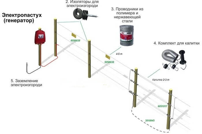 Основные элементы для построения электропастуха (электроизгороди): генератор импульсов, изоляторы, проводники, комплект для калитки.