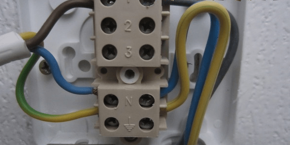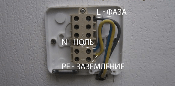 определяется расцветкой. Синий — это всегда ноль, и подключать его нужно там, где написана буква N. Жёлтый провод крепится к заземлению. Чёрный провод является фазой и соединяется в местах, обозначенных цифрами. Аналогично крепятся провода и второго кабеля.