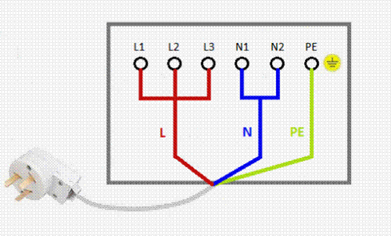 При таком монтаже фаза (красный) подключается к клеммам L1, L2, L3. Так как провод трехжильный, то на контакты устанавливают медные перемычки (они идут в комплекте с техникой). На N1, N2 устанавливают ноль (синий) и медную перемычку. РЕ — земля (зеленый). Все контакты затягиваются, кабель фиксируют специальным зажимом. Крышку устанавливают обратно. В розетке предусмотрено 3 контакта: верхний — земля, два нижних — фаза и ноль.