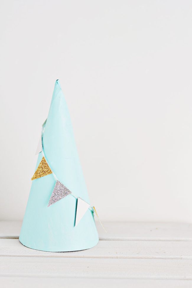 - Картонный конус любого цвета, украшают гирляндой, для которой берем нить и клеим на нее треугольники из бумаги или фольги.