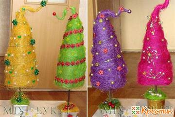 Основу-конус смазываем клеем ПВА, и снизу вверх плотно накручиваем толстые грубые нити нужного цвета. Украшаем бусинами, пуговицами, стразами.