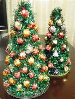 Основой под елку может послужить любая бутылка, ее оклеиваем двухсторонним скотчем. Начиная снизу, рядами приклеиваем конфеты на скотч, стараясь не оставлять просветов между фантиками. Конфеты подойдут любые, но шоколадные более тяжелые по весу, поэтому их сложнее прикрепить. Конфетные ряды чередуем с рядами мишуры. Верх елки лучше завершить мишурой, чтобы не утяжелять ее. Верхушку выполните из мишуры другого цвета, или конфет, фантики которых скрепите между собой степлером в виде звезды.