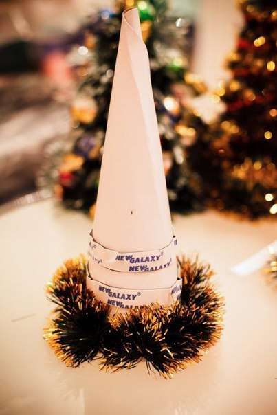 Для того чтобы сделать елку из мишуры и конфет нам понадобится картон, мишура, клей и конфеты. Первым делом нужно из листа картона свернуть конус и скрепить края степлером, после чего, по спирали, приклеиваем к конусу мишуру. Наряжаем подобную ёлочку конфетами. Украшение для стола готово!