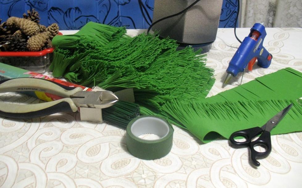 В основе ёлки — пенопластовый конус. Размер конуса зависит от желаемой величины ёлочки.