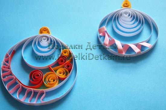 После установки пятиконечной верхушки приступаем к изготовлению ёлочных украшений. Из разноцветных полосок следует скрутить свободные «роллы», которые оформить затем в различные элементы квиллинга. Или же оставить в первоначальном виде, приклеив россыпью на ёлку.