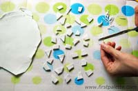 Сделайте бант из ленты, а в центр приклейте бусины. Бумажное полотенце нарежьте на квадратики размером 1 на 1 сантиметр.