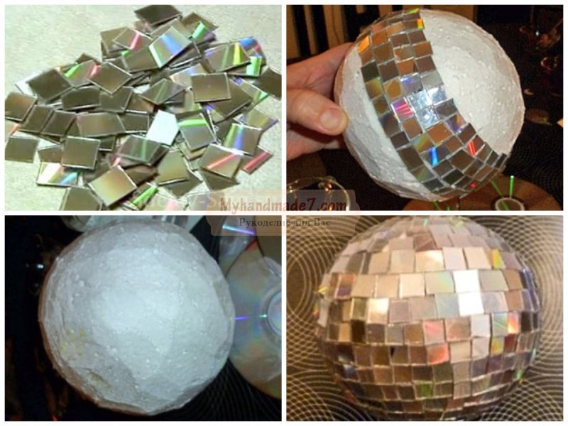 Для такого шара нам понадобится пенопластовая круглая основа и термо-клей, который надежно приклеит элементы. СД надо нарезать ножницами на небольшие квадраты, которые затем надо приклеивать на основу. Первый ряд мы будем приклеивать посередине, располагая блестящие квадраты близко друг к другу. Затем надо приклеивать их в шахматном порядке, пока полностью не будет заполнена поверхность основы. С одной стороны надо сделать петельку, чтобы шар можно было подвесить на ветку дерева.