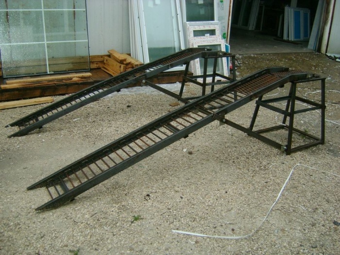 Несущие элементы, «пятки» на которых будет крепится лесенка для заезда должны иметь ширину порядка 40-45см. Опоры свариваются в виде трапеции, где низ, основание имеет ширину на 10-15 см большую, чем верх. Это необходимо для придания устойчивости конструкции. Лесенка для заезда изготавливается из двух кусков уголка с поперечно наваренным прутком, позволяющим колесам не скользить при подъеме на конструкцию.
