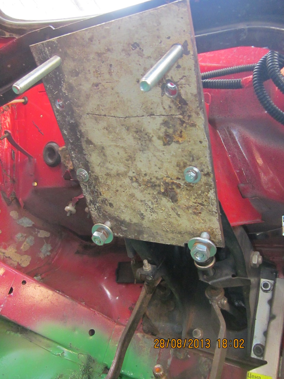 - Под панелью прикрутите кронштейн ЭУР, не забыв продеть в него провода выключателя зажигания. Для этого используйте 2 штатные шпильки М8, а также 2 болта М6 (под них есть резьбовые отверстия) и 2 болта М8 (под них придется сверлить отверстия).