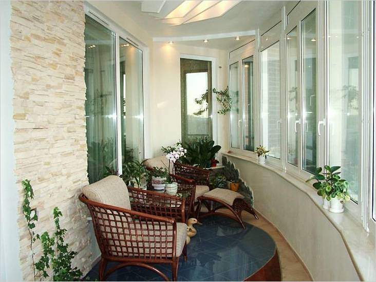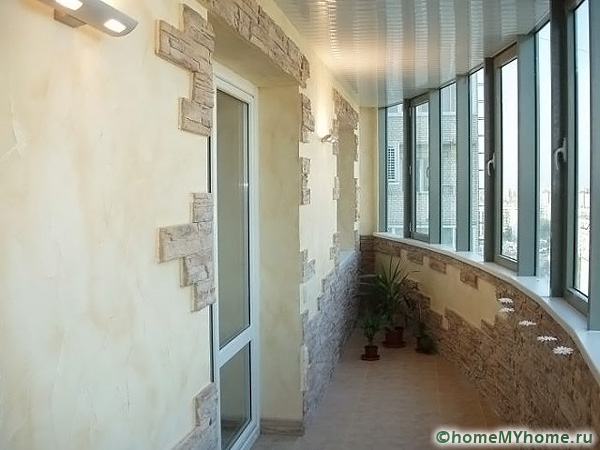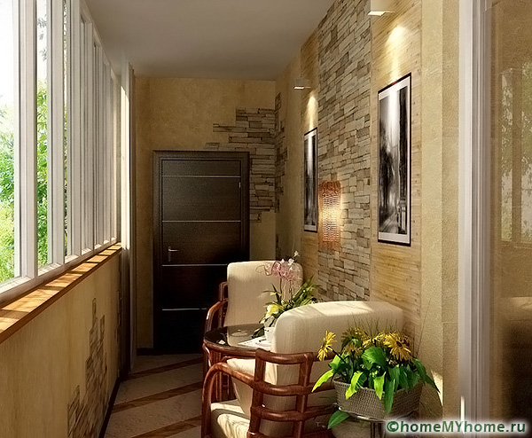Часть внешней стены дома, которая оказалась «внутри» остекленного балкона, отделывается в соответствии с общим дизайном оранжереи. В этом случае о весе настенного покрытия (плитка, камень, декоративная штукатурка) можно не беспокоиться.