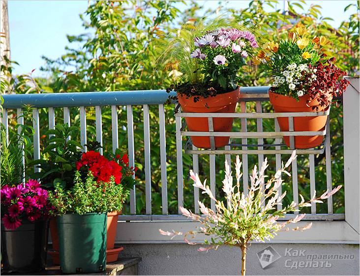 - в цветочных горшках и кашпо в закрепленных на стене балкона специальных подставках;