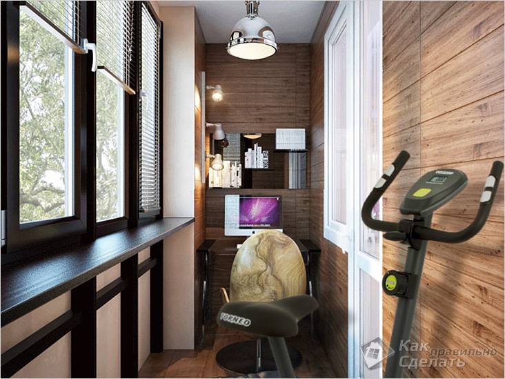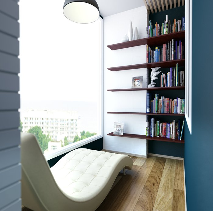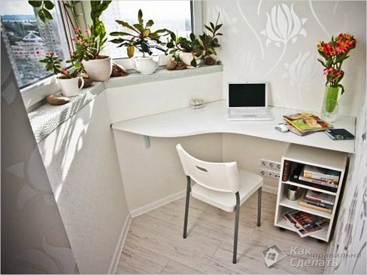 Балкон вполне может стать отличным местом для кабинета или же мастерской. В стандартной квартире для этой цели нередко просто не хватает места, а в этом помещении – его вполне достаточно для установки стола и стула, а также полок для хранения различных инструментов для работы. Женская половина семьи может организовать для себя швейную мастерскую или же удобное место для занятий другим рукодельем.