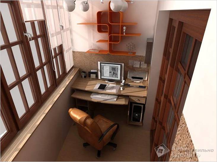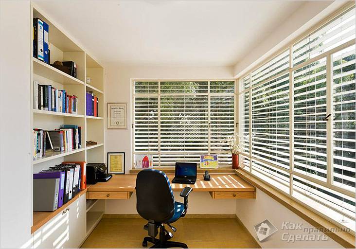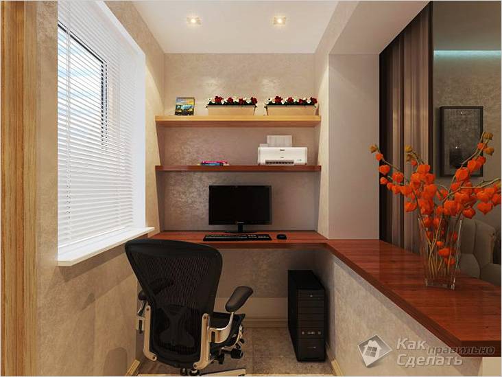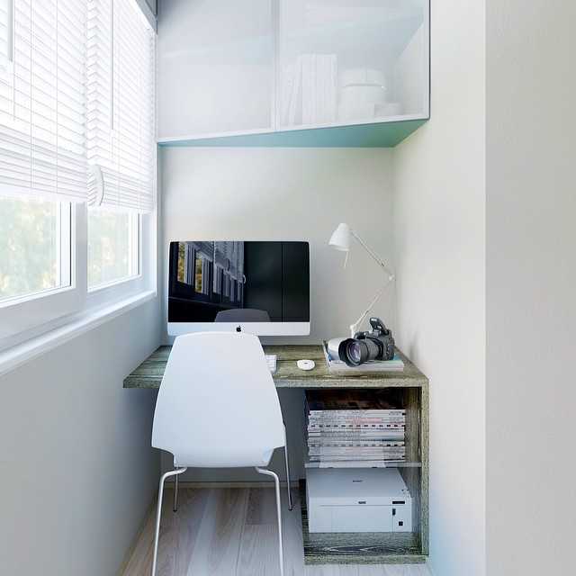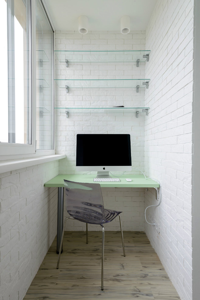 Для обустройства кабинета подойдет и узкий балкон – на нем отлично поместится угловой или прямой стол, над которым закрепляются полки для различных периферийных устройств, входящих в комплект к компьютеру, или же папок с документами и книг. Мастерская или кабинет обычно оформляется в светлых тонах, чтобы в разное время суток и при любой погоде цвет способствовал более интенсивному освещению.