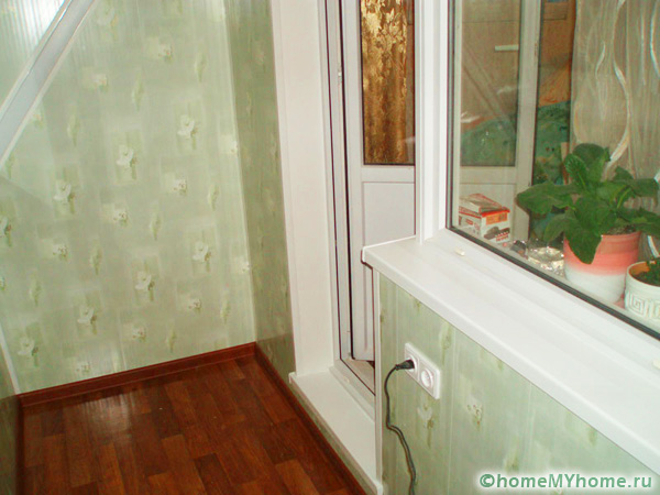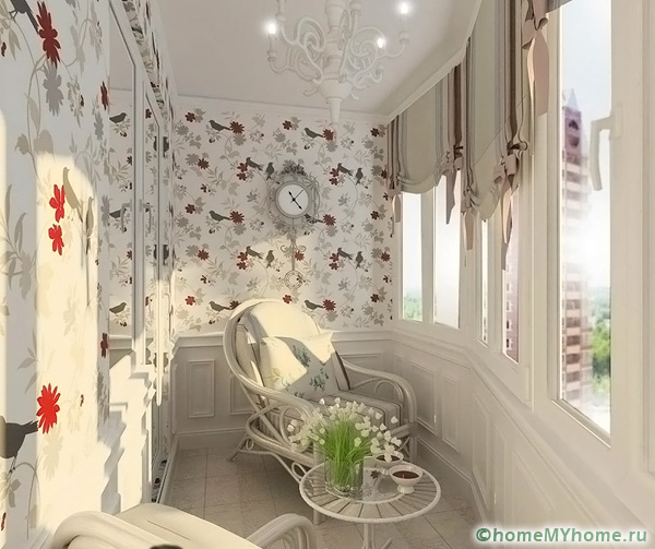 - Знакомые всем обои также вполне могут быть применены для отделки вертикальных поверхностей балкона. Но чтобы они смотрелись эффектно, поверхности под их поклейку должны быть выровнены до идеала.