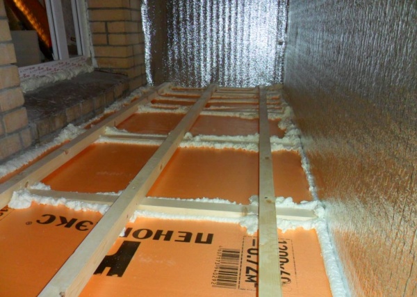 Поверх слоя пенофола устраивается каркас из бруса, в ячейки каркаса закладывается пеноплекс требуемой толщины.