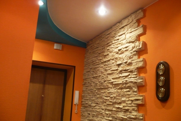 Каменные мотивы в дизайне маленьких прихожих распространены не менее, чем обои на растительную тематику. Чаще всего в роли инструмента выражения каменной текстуры выступает декоративный гипс. Он легкий и удобен для облицовки.
