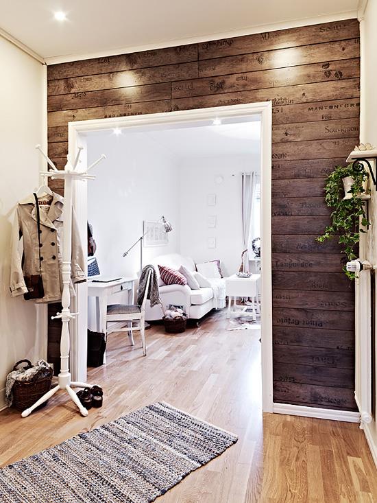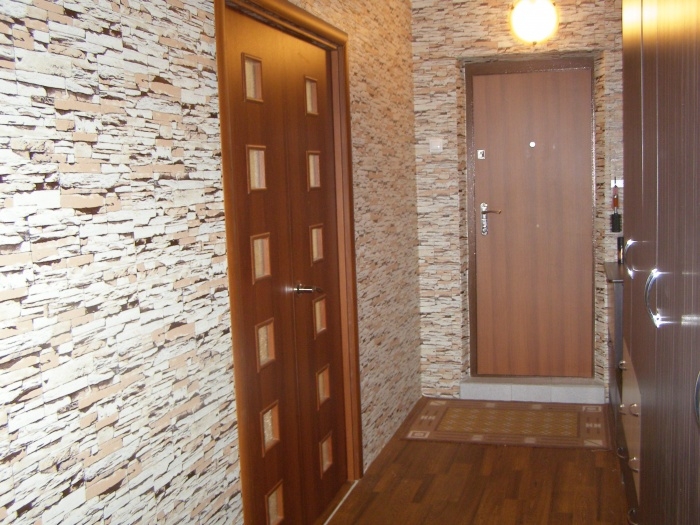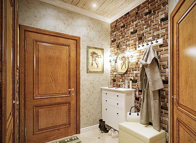 Обои с имитацией кирпича, камня и дерево по-прежнему актуальны. При желании можно использовать натуральную отделку, она придает особую роскошь и создает эффектную зону при входе в квартиру.