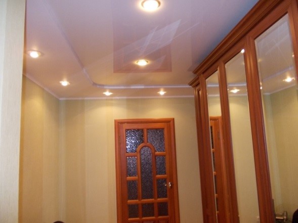 Иной, достаточно простой, но гораздо более распространенный вариант — натяжные потолки. Положительных моментов от этого решения немало: тут и более высокая эстетическая привлекательность, и возможность выразительной декоративной отделки, и широкий выбор подбора светильников для организации освещения прихожей. Фото ниже иллюистрирует элементарный вариант, привлекающий внимание именно своей неприхотливостью.