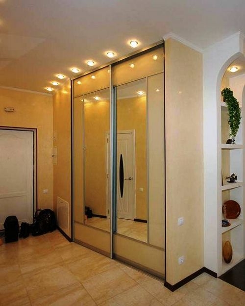 Маленькая прихожая – зона, не имеющая окон. Свет проникает сквозь открытые двери и окна из других комнат. При этом коридор часто остается темным. Именно поэтому следует подобрать дополнительное освещение. Идеально подойдут для темных малогабаритных коридоров точечные осветительные приборы либо бра над зеркалом. Зрительно увеличить прихожую помогут красивые светильники, размещенные зигзагообразно.
