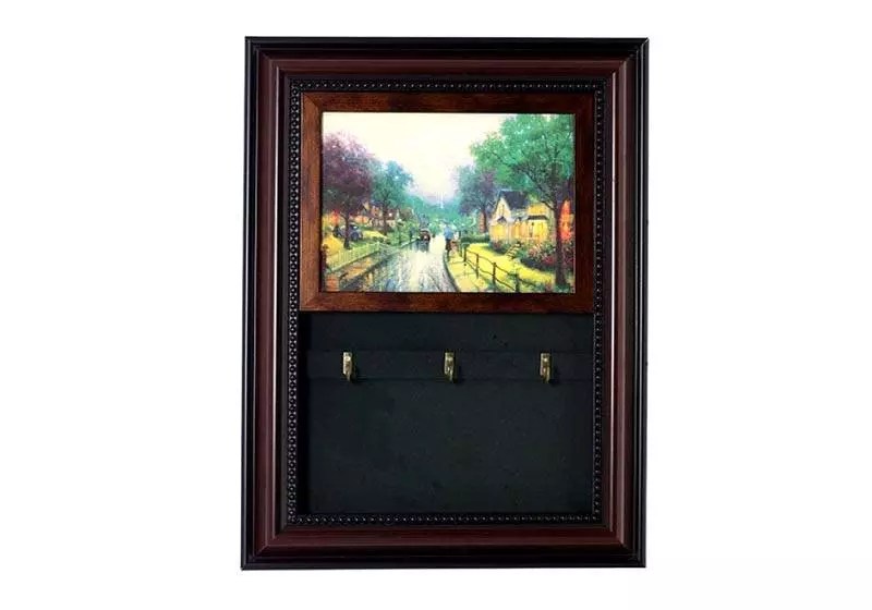Еще один вариант изготовления ключницы — рамка. Она отлично сочетается со стеной, Делает интерьер необычным и оригинальным. Достаточно соорудить из дерева или других материалов каркас, прикрепить к нему крючки для ключей и повесить на стену. При наличии прочной отделки, она выполняет функцию выделенного изображения на стене. Для фиксации рамки на стене используют клей или дополнительные крепежы. Способ установки определяется индивидуально в зависимости от материала, из которого изготовлены стены.