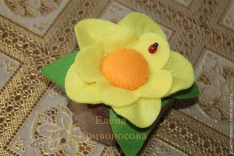 14. Приклейте готовый кактус из фетра к основе-горшку. Вокруг приклейте мелкие камушки или бусинки, бисер.