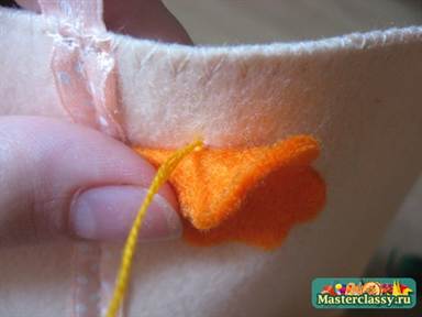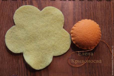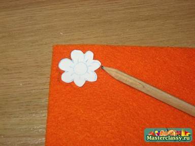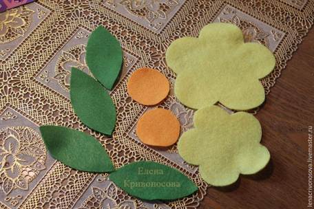 11. Очередь цветка: вырежьте из белого фетра два произвольных цветка и небольшую кисть, из фетра оранжевого цвета вырежьте кружок, который не сильно надрежьте по всему периметру.