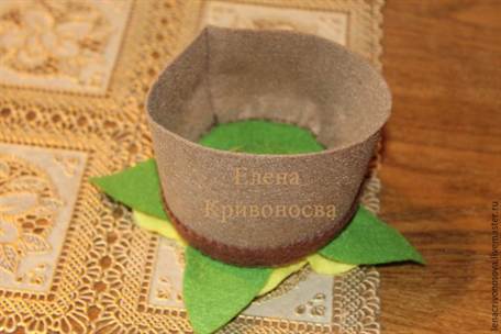 6. Из фетра зеленого и салатового цвета вырежьте траву, пришейте ее к верхней части пенька.