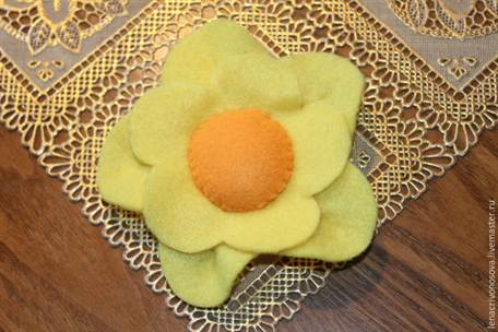 12. Поместите белую кисточку в оранжевый круг, после в центр белых цветов. Взяв заготовку, согните его в бутон и сшейте цветок.