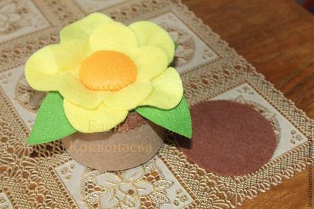 Теперь делаем цветок для украшения вашего кактуса. Вырезаем из разноцветного фетра два круга, один больше, другой меньше. Положив друг на друга, сформируйте цветок, и внизу смотайте ниткой вокруг, а потом закрепите.
