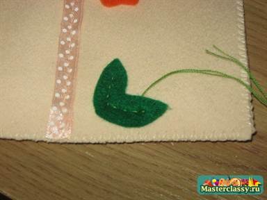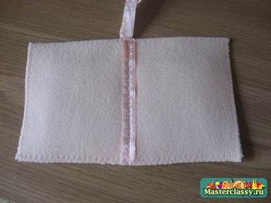 Нитью в тон пришейте к бокам красного яблока с внутренней стороны обе полосы. Эти полосы станут застежкой книжки.