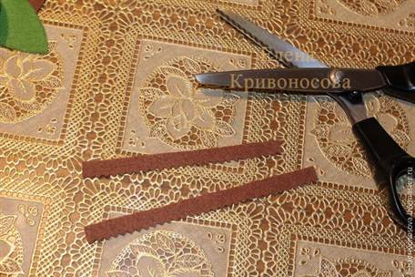 - отрезки фетра разных цветов: коричневый (25 на 15), бежевый (9 на 9), красный (5 на 8), бежевый (9 на 8), белый (10 на 7), зеленый (5,5 на 6,5), салатовый (5 на 6).