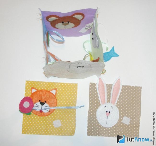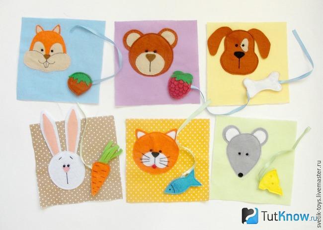 Возьмите обрезки фетра или другой ткани, которая не осыпается и достаточно плотная, цветные нитки, клей, ножницы, картон, атласную тонкую ленту, синтепон или силикон для наполнения фигурок.