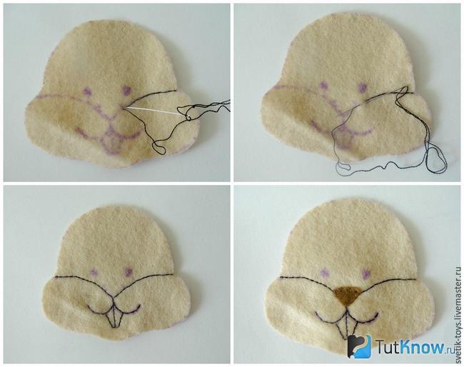 - Теперь, в маленькой фетровой заготовке отмечаем две дырочки при помощи черной нитки, делая по нескольку стежков.