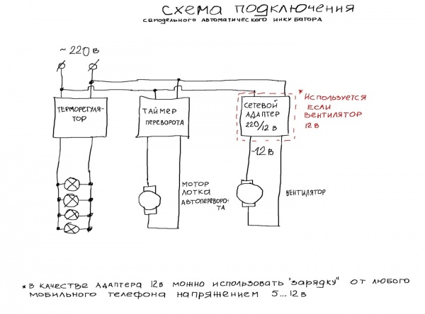 На рисунке для регулирования температурой предложена примитивная схема, которая не отличается особой точностью поддержания температуры. Она также сильно зависит от напряжения сети и температуры помещения, в котором стоит инкубатор.