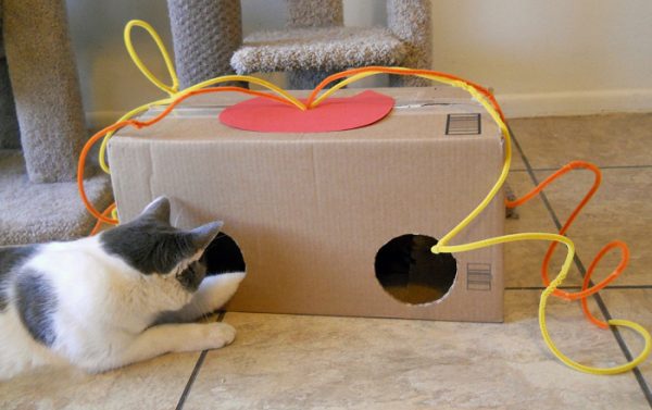 Любая кошка обожает коробки. Она забирается внутрь, сидит в засаде, внимательно следя за проходящими мимо. Картонные коробки — хороший и простой материал для создания игрушки.