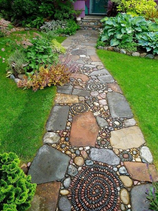 Наличие большого количества цветов и доступность материала, позволяют создать дорожку с самыми разными рисунками, которые сделают ландшафт вашего участка настоящим произведением искусства.