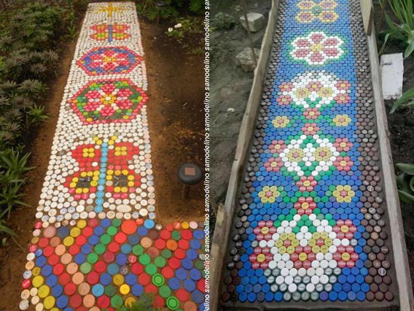 Садовая дорожка из пластмассовых крышек. Довольно необычный, но вместе с тем яркий вариант тропинки в виде мозаики из разноцветных крышечек от пластиковых бутылок.