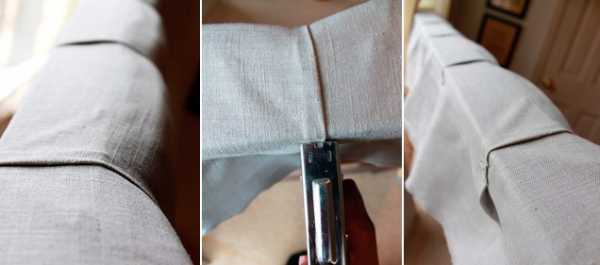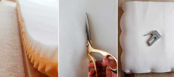 Осталось определиться со способом. Если мы хотим сделать наше изголовье при помощи степплера, то желательно использовать однородный материал для наполнения (смягчения) спинки, такой как поролон, который необходимо предварительно закрепить на спинке при помощи клея или того же мебельного степплера в нескольких местах, чтобы он крепко держался. При этом способе необходимо подготовить ткань с припусками 1,5-2см для оборотной стороны и около 10 см для лицевой стороны. Далее необходимо приложить ткань на заднюю поверхность спинки, подвернуть край на 1,5 — 2 см и начать пристреливать степплером. Когда закончите с оборотной стороной, приступайте к лицевой. Для того, чтобы на лицевой стороне изголовья не были видны скобы для степплера — натяните ткань, заведите припуски на заднюю сторону и там, предварительно подогнув 1,5-2см закрепите степплером.