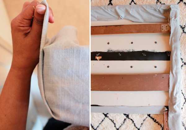 Работа усложняется тем, что изголовье представляет собой объемную фигуру и натягивать ткань в процессе довольно трудно. Такую работу будет намного удобнее проводить вдвоем, натягивая ткань с двух сторон.