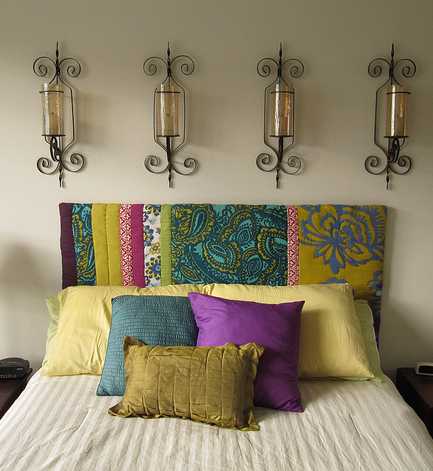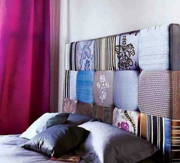 помогут заполнить пространство изголовья. Можно использовать разноцветные либо однотонные элементы; - стеганое изголовье