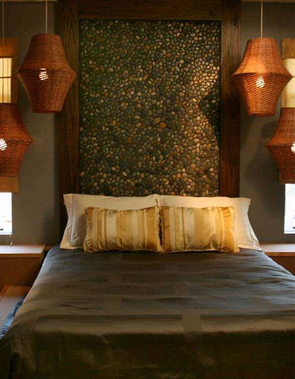 В качестве альтернативного материала для кроватного изголовья можно использовать мозаику и камень. Из них вы сделаете интересные узоры с элементами морской гальки, плитки и даже стеклянных кусочков.