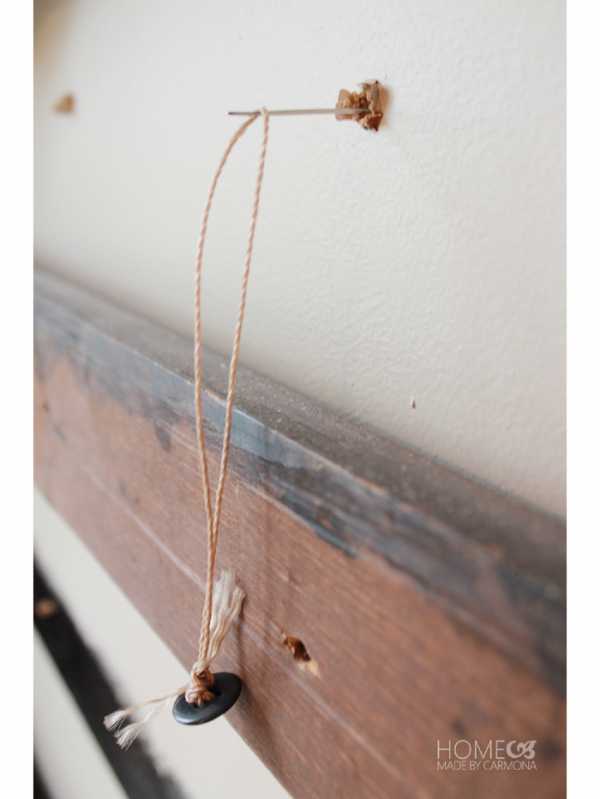 Шнуры протягивают через пуговицы и затягивают таким образом, чтобы пуговицы оказались в высверленных отверстиях.